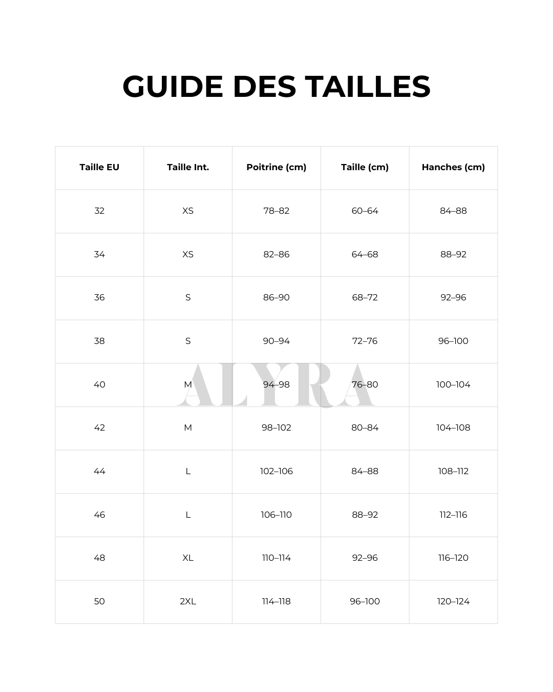 - Pour un ajustement parfait, mesurez poitrine, taille et hanches et comparez avec le tableau.